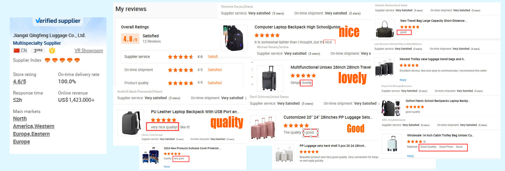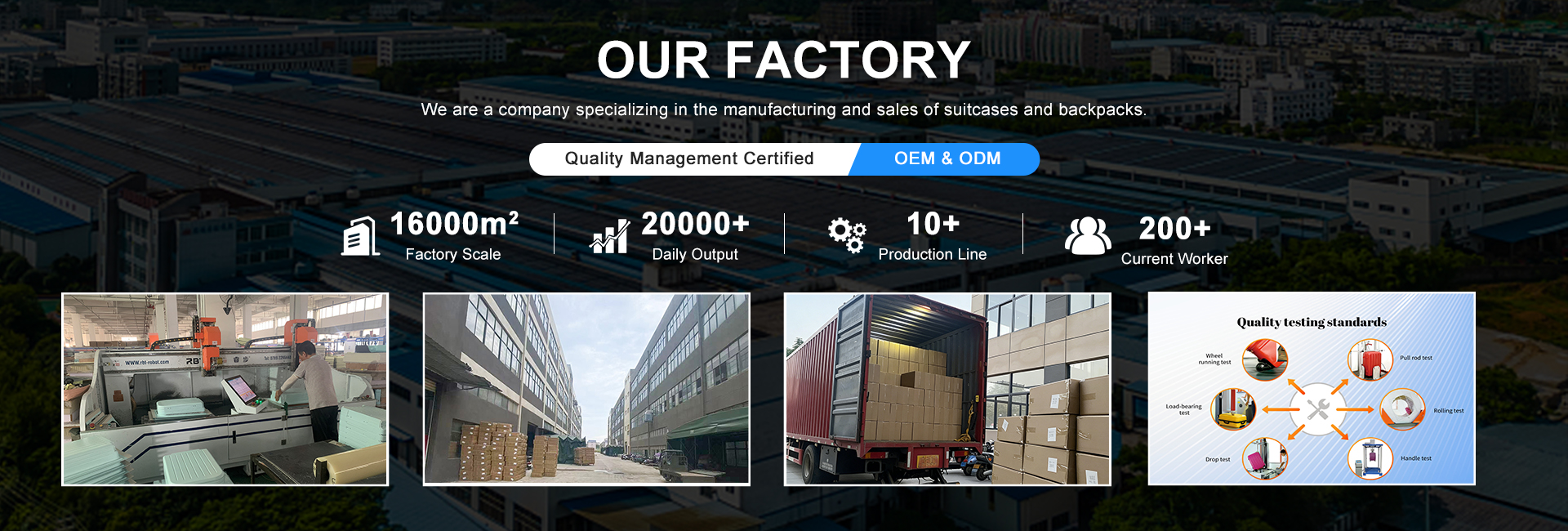 江西青风箱包有限公司有更多超过10年的生产经验箱包行业,我们专业销售ABS,PP,PC,软行李箱和各种背包,提供一站式采购服务,我们有专业的设计团队,qc小组和高高效的售前和售后服务团队,提供有竞争力的价格和12小时有效的服务支持我们的客户。我们的工厂占地面积16,000平方米; 我们有3台片材挤出机,每日生产能力20,000台,吸塑机10台,切割机2台,和7条生产线,日生产能力为8,000 pcs。我公司坚持以满足客户为出发点对产品质量的要求和持续改进的原则产品质量,坚持严格的质量管理提供稳定的产品质量,快速的交货支持;我们为客户提供各种OEM和ODM服务,希望通过我们的专业知识和不懈的努力,我们可以提供高效的产品定制,合理的成本和降低后新兴品牌的销售成本。